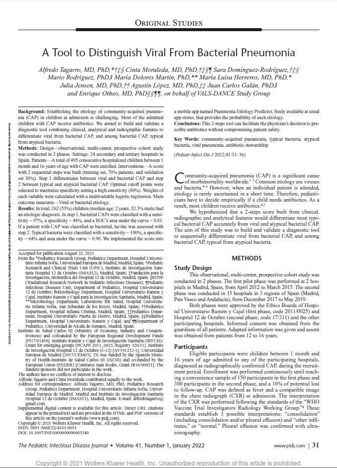 Julia Jensen del departamento de Pediatría ha colaborado en el estudio “A Tool to Distinguish Viral From Bacterial Pneumonia” publicado en la revista The Pediatric infectious disease journal. El objetivo del estudio era construir y validar una herramienta de diagnóstico que combinara características clínicas, analíticas y radiográficas para diferenciar la NAC viral de la bacteriana, y entre la NAC bacteriana, la típica de la bacteria atípica.