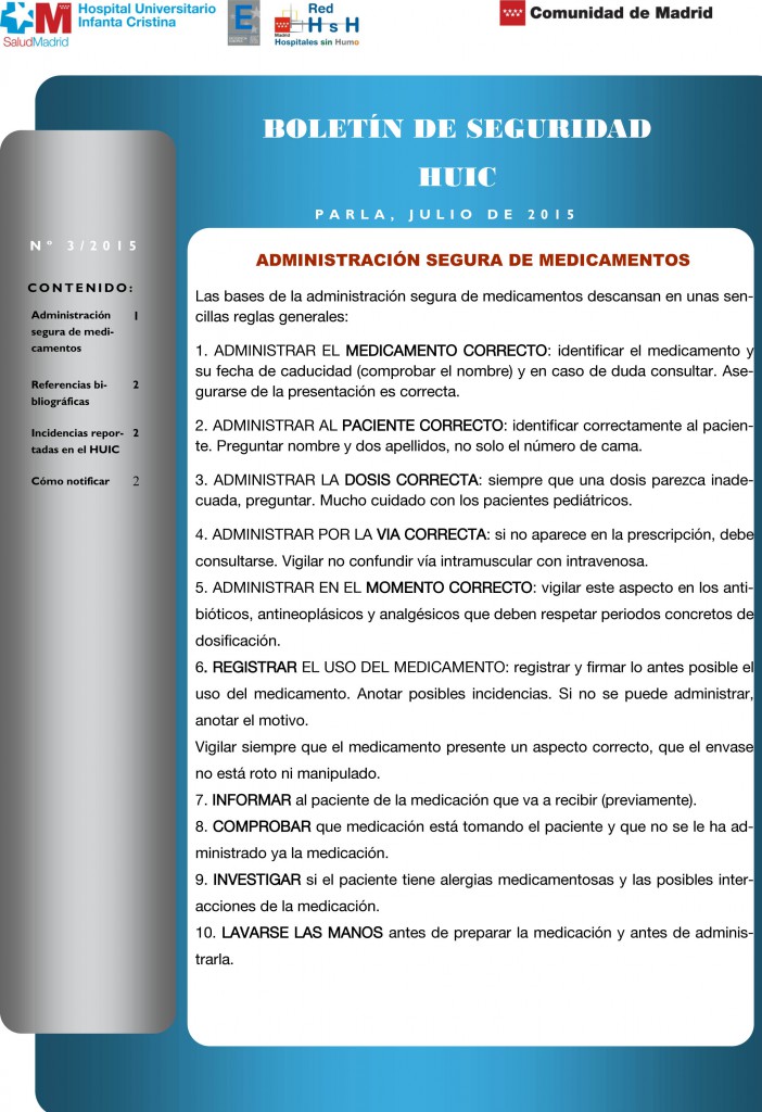 Ya puedes consultar el tercer número del Boletín de Seguridad del HUIC, que en esta edición informa sobre la Administración segura de medicamentos, los incidentes de seguridad recogidos hasta el 31 de junio de 2015 y un tutorial sobre cómo utilizar el buzón anónimo para notificar incidentes: Boletín de Seguridad nº 3 2015