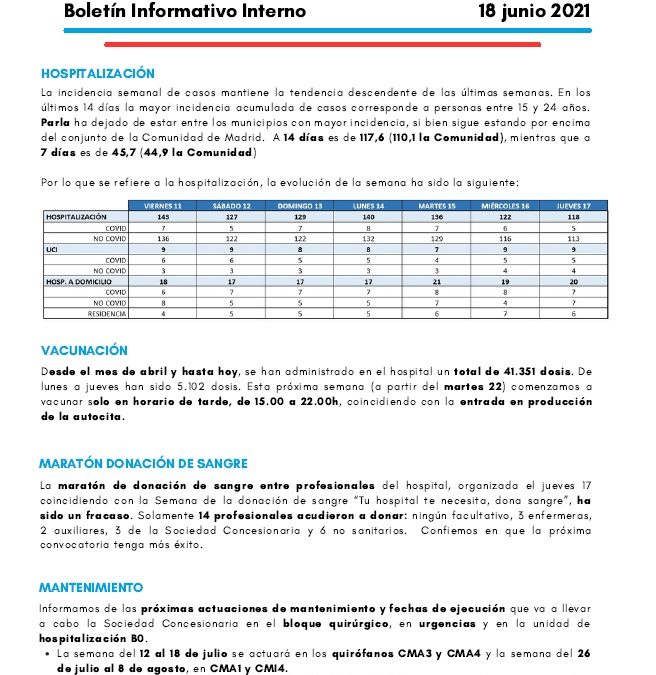 Adjuntamos el Boletín Informativo Interno del 18/06/2021