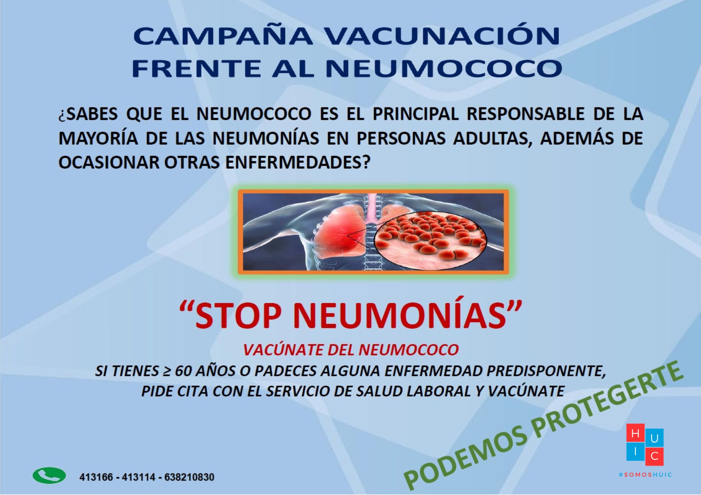 Estamos ofreciendo la Vacuna Antineumocócica 20-valente (VNC20) a los profesionales de 60 años o más, grupo en el cual está indicada la vacunación por edad sin factores de riesgo, frente a neumococo en el adulto. La administración de dicha vacuna ha demostrado una respuesta inmune superior, ya que cubre un mayor número de serotipos, especialmente importantes en la epidemiología de nuestro país y de nuestra comunidad autónoma.