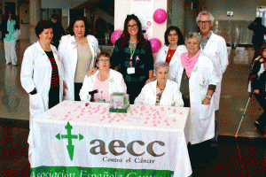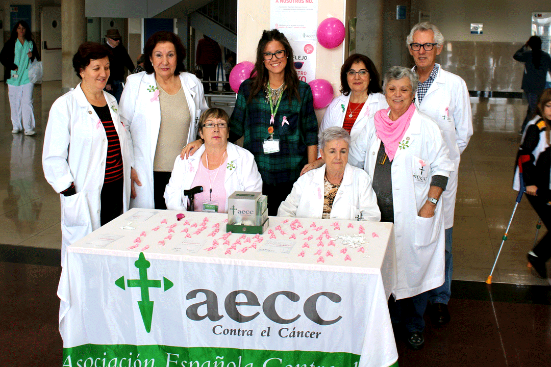 La Asociación Española contra el Cáncer ha instalado una mesa en el hall del Hospital para conmemorar el Día Mundial contra el Cáncer de Mama. Durante toda la jornada, voluntarios de la asociación repartirán información sobre los servicios que prestan, como la atención psicológica gratuita para enfermos y familiares, así como recaudarán donaciones para la ONG. Este año invitan a participar en la divulgación de sus actividades en las redes sociales con el hashtag #Súmatealrosa.