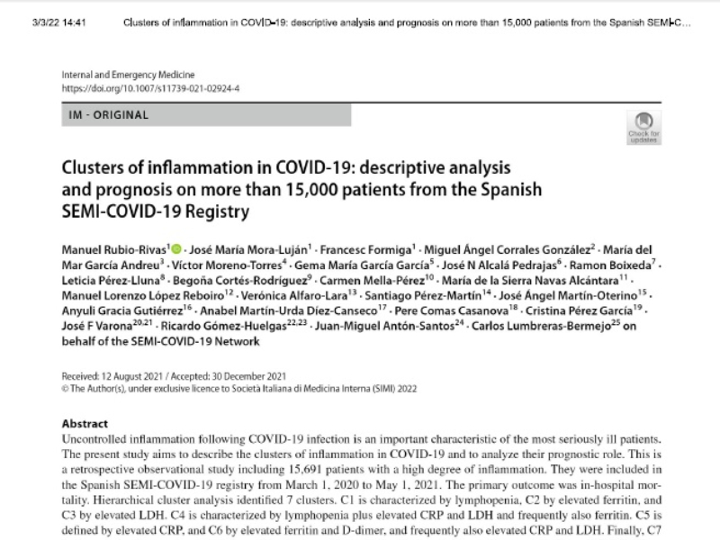 Juan Miguel Antón Santos, del servicio de Medicina Interna, ha colaborado en el estudio observacional “Clusters of inflammation in COVID-19: descriptive analysis and prognosis on more than 15,000 patients from the Spanish SEMI-COVID-19 Registry”, publicado en la revista Internal and emergency medicine. La inflamación descontrolada que sigue a la infección por COVID-19 es una característica importante de los pacientes más graves. El presente estudio tuvo como objetivo describir los grupos de inflamación en COVID-19 y analizar su papel pronóstico.