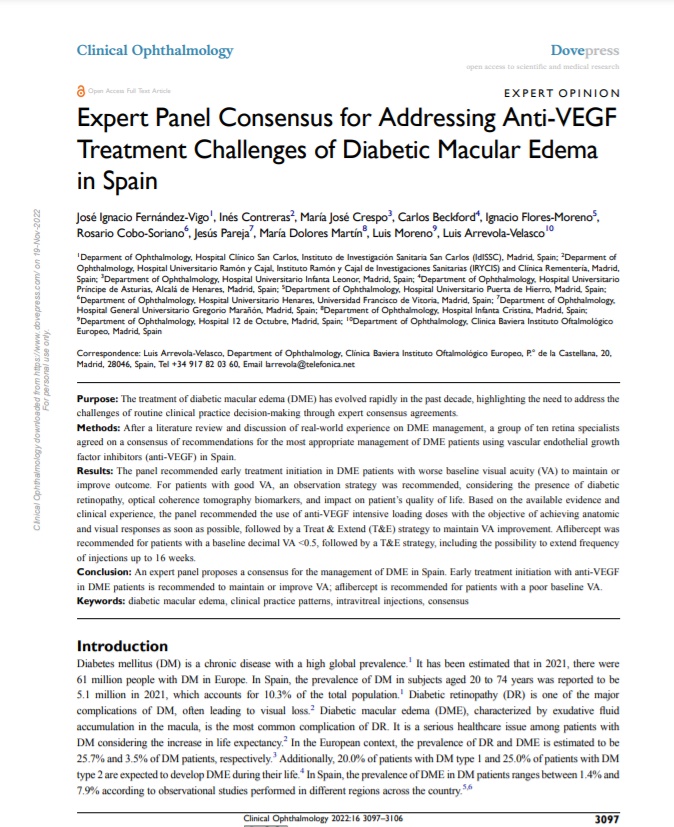 La Dra. Mª Dolores Martin Sánchez, Jefe de Servicio de Oftalmología, ha participado en el Comité de expertos de Retina que ha publicado en Dove Medical Press el manual para establecer el tratamiento del edema macular diabético en el ámbito español titulado ”Consenso del panel de expertos para abordar los desafíos del tratamiento anti-VEGF del edema macular diabético en España”.