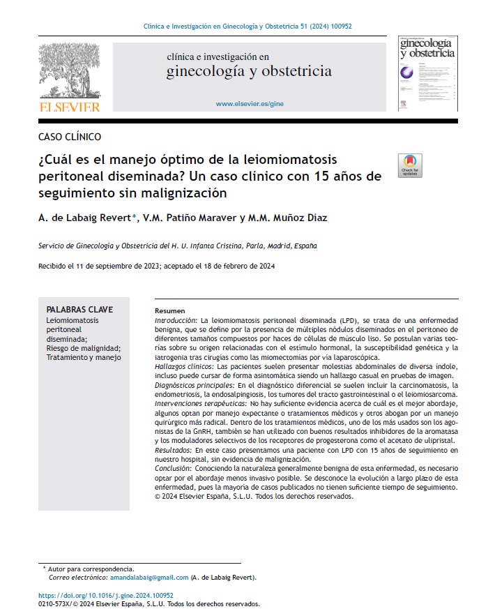 ¿Cuál es el manejo óptimo de la leiomiomatosis peritoneal diseminada? Un caso clínico con 15 años de seguimiento sin malignización | Amanda Labaig, Vicente Patiño, Mª Mar Muñoz