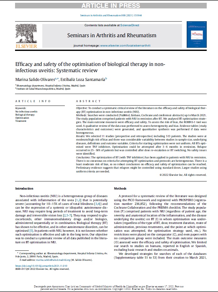 María Salido Olivares, del servicio de Reumatología, ha colaborado en el estudio “Efficacy and safety of the optimisation of biological therapy in non-infectious uveitis: Systematic review”, publicado en la revista Seminars in arthritis and rheumatism. El objetivo del estudio fue realizar una revisión crítica sistemática de la literatura sobre la eficacia y seguridad de la optimización de la terapia biológica en la uveítis no infecciosa.