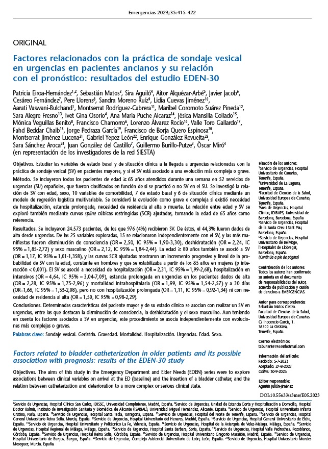 Sandra Moreno Ruíz, del servicio de Urgencias, ha participado en el estudio “Factores relacionados con la práctica de sondaje vesical en urgencias en pacientes ancianos y su relación con el pronóstico: resultados del estudio EDEN-30”, publicado en la Revista Científica de la Sociedad Española de Medicina de Urgencias y Emergencias.