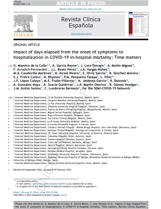 Juan Miguel Antón Santos, del servicio de Medicina Interna, ha participado en el trabajo “Impact of days elapsed from the onset of symptoms to hospitalization in COVID-19 in-hospital mortality: time matters”, publicado en la Revista Clínica Española.