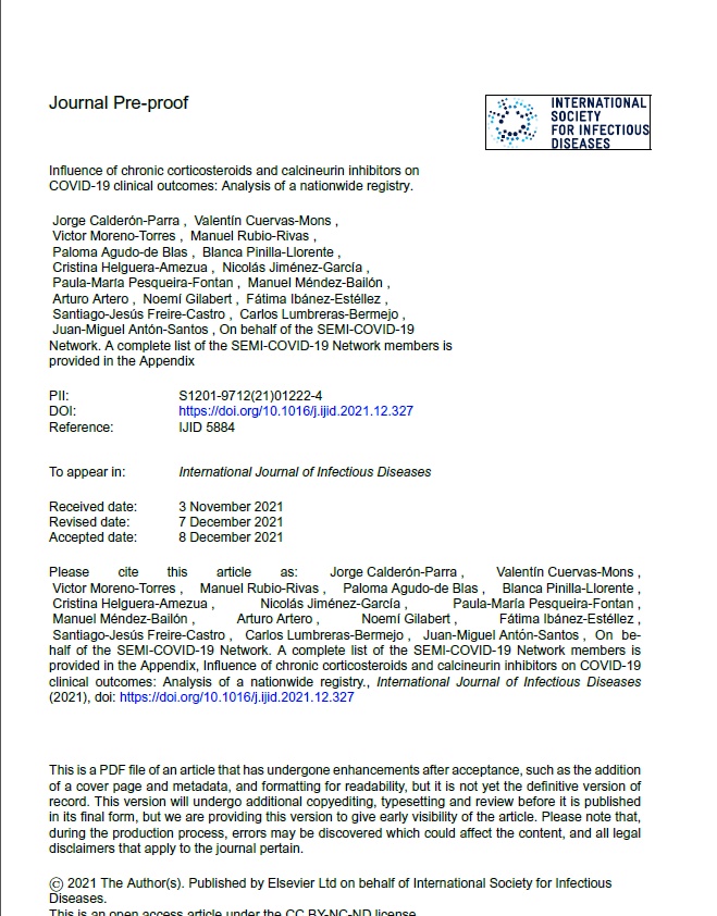 Juan Miguel Antón Santos, del servicio de Medicina interna y otros miembros del grupo SEMI-COVID-19, han participado en el estudio “Influence of chronic corticosteroids and calcineurin inhibitors on COVID-19 clinical outcomes: Analysis of a nationwide registry”, publicado en la revista Medicina Clínica. El objetivo del estudio fue analizar si los subgrupos de medicamentos inmunosupresores (IS) confieren diferentes resultados en COVID-19.