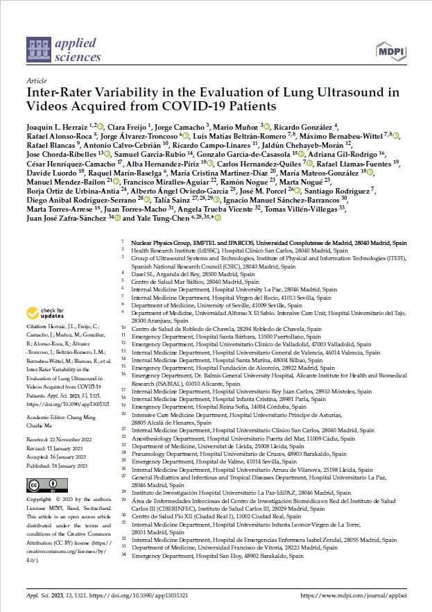 Alba Hernández, Davide Luordo y María Mateos, del servicio de Medicina Interna, han participado en el trabajo “Inter-Rater Variability in the Evaluation of Lung Ultrasound in Videos Acquired from COVID-19 Patients”, publicado en la revista Applied Sciences.