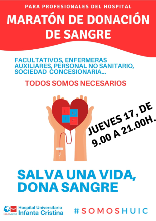 Este jueves 18 de junio, coincidiendo con la Semana de la Donación de Sangre “Tu hospital te necesita, dona sangre”, organizada por el Centro de Transfusiones de la Comunidad de Madrid, el hospital ha promovido una MARATÓN DE SANGRE PARA PROFESIONALES que se realizará en horario de 9.00 a 21.00 h.