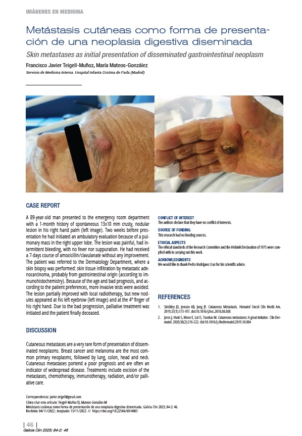 Francisco Javier Teigell Muñoz y María Mateos González, del servicio de Medicina Interna, han escrito el siguiente case report “Metástasis cutáneas como forma de presentación de una neoplasia digestiva diseminada”, publicado en la revista Galicia Clínica.