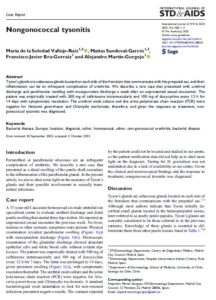 En este trabajo se describe un caso raro que presentaba secreción uretral e hinchazón parafrenular con secreción mucopurulenta una semana después de un encuentro sexual sin protección. El paciente fue tratado empíricamente con 500 mg de ceftriaxona intramuscularmente y 100 mg de doxiciclina cada 12 h durante 14 días con resolución sintomática. El cultivo de hisopo uretral y la reacción en cadena de la orina de la polimerasa (PCR) fueron negativos para Neisseria gonorrhoeae y Chlamydia trachomatis, por lo tanto, y dada la respuesta al tratamiento, se diagnosticó la tisonitis no agonocúcica.