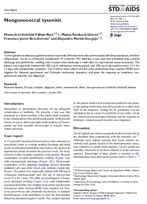 Mª Soledad Vallejo Ruiz, del servicio de Dermatología, ha participado en el trabajo “Nongonococcal tysonitis”, publicado en la revista International Journal of STD & AIDS.