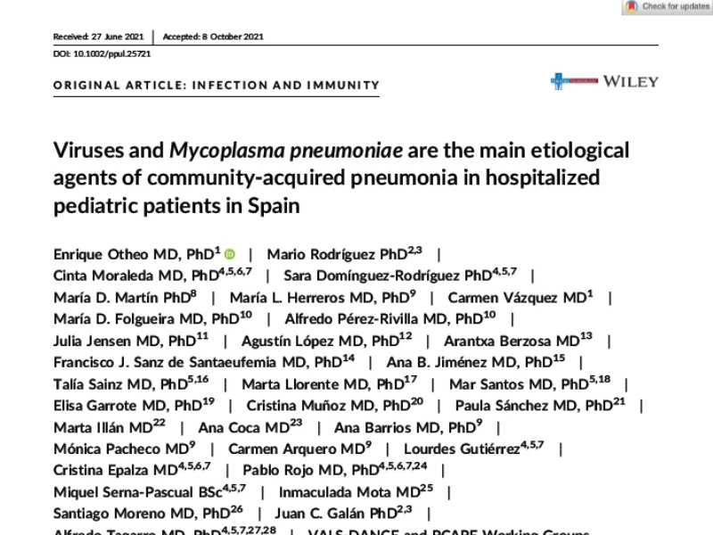 Julia Jensen, del departamento de Pediatría, ha participado en el estudio “Viruses and Mycoplasma pneumoniae are the main etiological agents of community-acquired pneumonia in hospitalized pediatric patients in Spain”, que se ha publicado en la revista Pediatric pulmonology. En el estudio se describe la etiología de la neumonía adquirida en la comunidad (NAC) en niños hospitalizados en España y se analizan los predictores de la etiología.