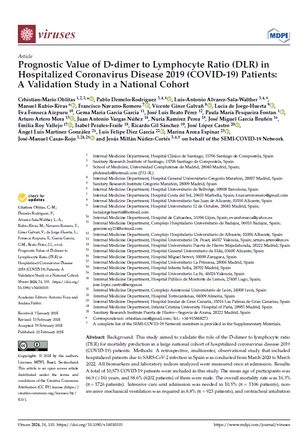 “Prognostic Value of D-dimer to Lymphocyte Ratio (DLR) in Hospitalized Coronavirus Disease 2019 (COVID-19) Patients: A Validation Study in a National Cohort” | José Manuel Casas Rojo