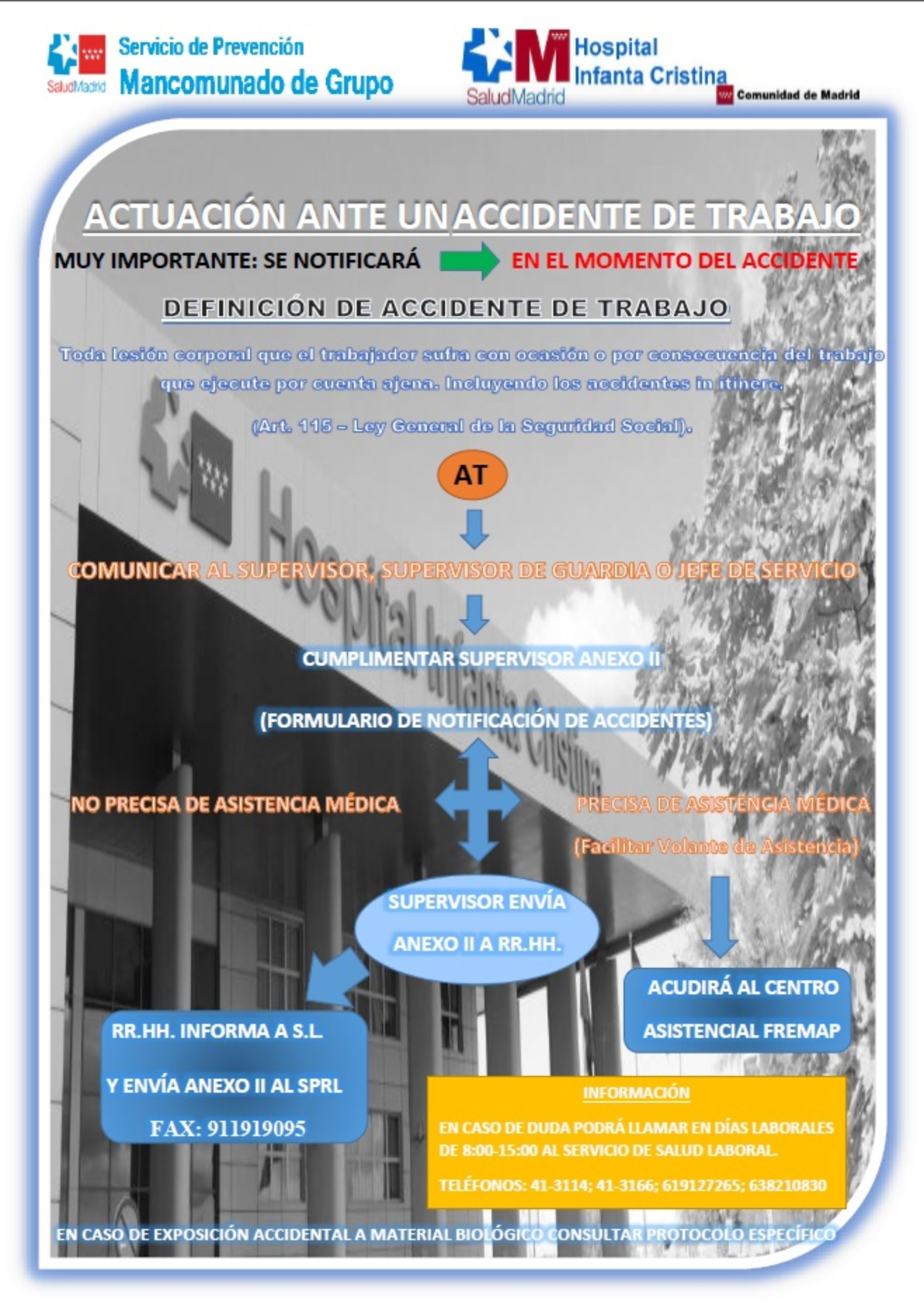 El Servicio de Prevención es una Unidad de Responsabilidad dentro del modelo organizativo de los nuevos hospitales de la CAM, aprobado por su consejo de administración, quedando todo ello recogido en el BOCM número 39 de 7 de febrero de 2008. Por RESOLUCIÓN de 27 de noviembre de 2014, del Director General de Recursos Humanos del Servicio Madrileño de Salud, por la que se ordena la publicación en el BOLETÍN OFICIAL DE LA COMUNIDAD DE MADRID del Acuerdo de constitución del Servicio de Prevención Mancomunado de Grupo se constituye como tal.