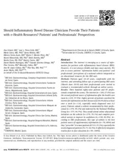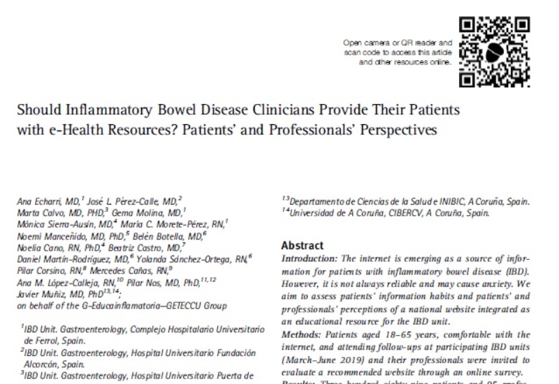 El trabajo ha evauado los hábitos de información de los pacientes y las percepciones de estos y los profesionales acerca de un sitio web nacional integrado como un recurso educativo para la unidad. 389 pacientes y 95 profesionales completaron la encuesta en línea, invitados a evaluar un sitio web recomendado. Según los profesionales de la Unidad de Enfermedad Inflamatoria Intestinal (EII), este tipo de sitio web es la mejor fuente de información del paciente, respaldando, además, la información profesional.