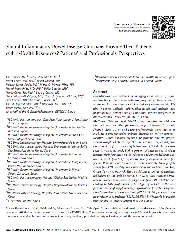 Daniel Martín Rodríguez y Yolanda Sánchez Ortega, responsable y enfermera del Servicio de Digestivo, han participado en el trabajo “Should Inflammatory Bowel Disease Clinicians Provide Their Patients with e-Health Resources?, Patients’ and Professionals Perspectives“, publicado en la revista Telemedicine and e-Health.