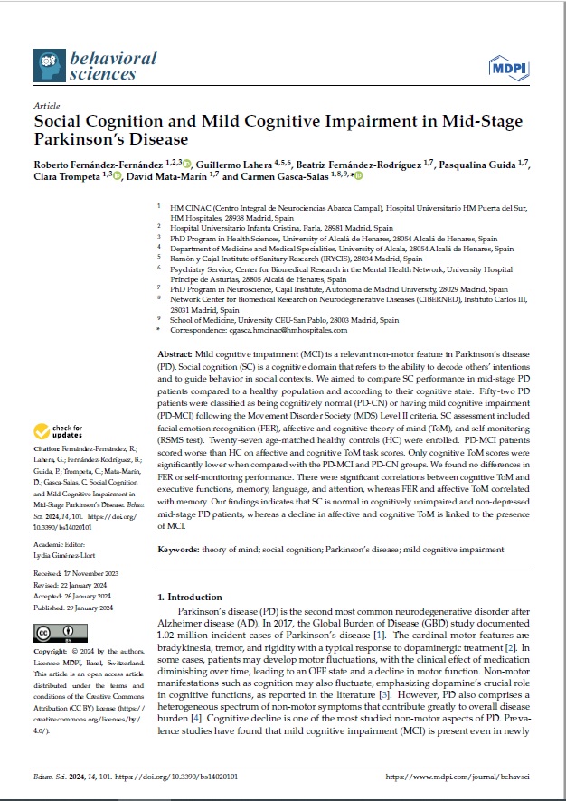 Roberto Fernández Fernández, del Servicio de Psiquiatría, ha participado en el artículo “Social Cognition and Mild Cognitive Impairment in Mid-Stage Parkinson’s Disease”, publicado en la Revista Behavioral Sciences.