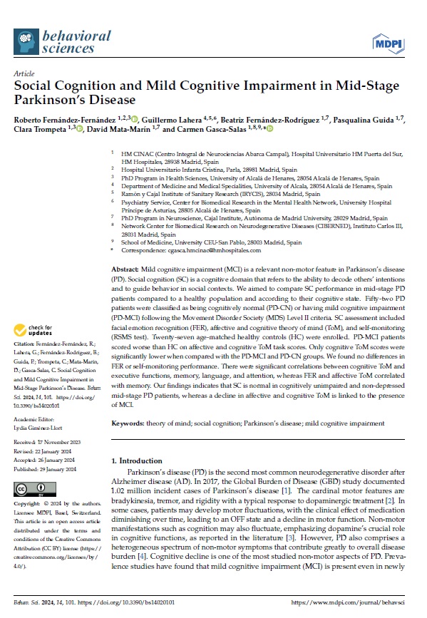 Roberto Fernández Fernández, del servicio de Psiquiatría, ha participado en el estudio “Social Cognition and Mild Cognitive Impairment in Mid-Stage Parkinson’s Disease“, publicado en la revista Behavioral Sciences.