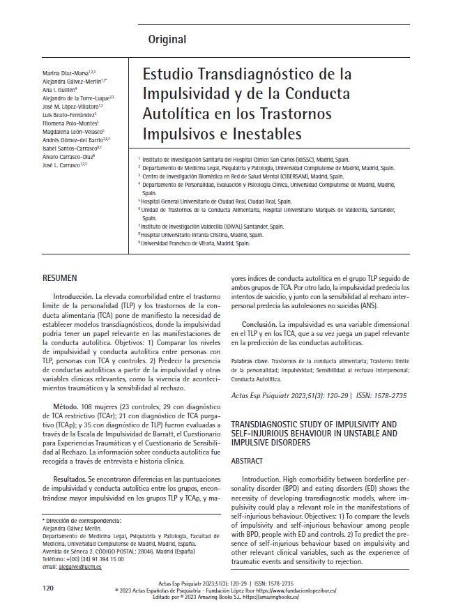 Los objetivos de este trabajo fueron comparar los niveles de impulsividad y conducta autolítica entre personas con TLP (trastorno límite de la personalidad), personas con TCA (trastornos de la conducta alimentaria) y controles sanos, y predecir la presencia de conducta autolítica a partir de la impulsividad y otras variables clínicas relevantes como la vivencia de acontecimientos traumáticos y la sensibilidad al rechazo.
