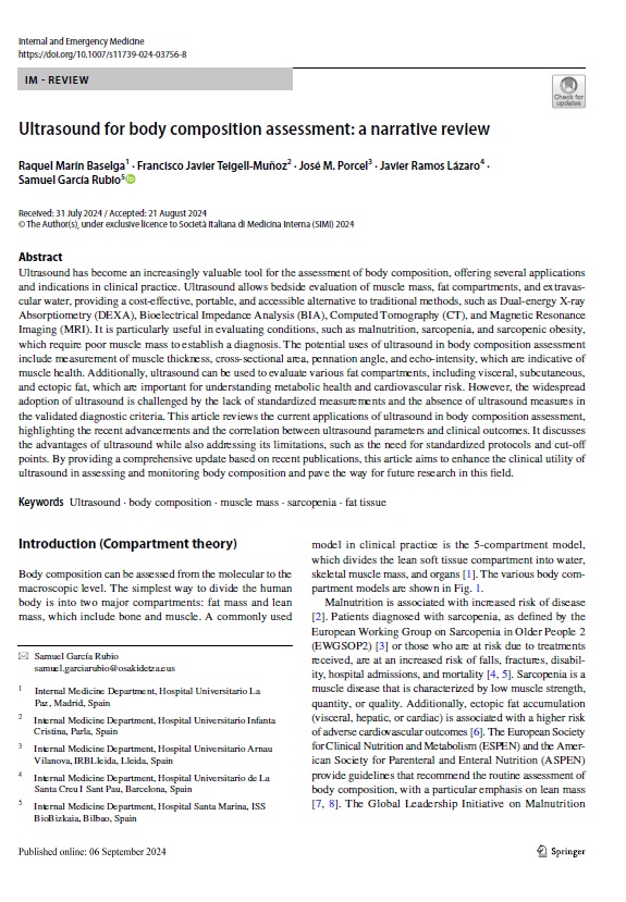 Francisco Javier Teigell-Muñoz, del servicio de Medicina Interna, ha participado en el trabajo “Ultrasound for body composition assessment: a narrative review”, publicado en la Revista Internal and Emergency Medicine.